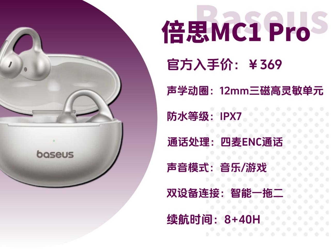 倍思 MC1 Pro 在这个价位里,属于各项表现都比较均衡的款式,没有明显的短板,日常使用很顺手。佩戴体验上,单耳 5.0g的重量很轻盈,耳夹处的云朵气囊设计戴着触感柔软,不会磨耳朵,和耳廓的贴合度也不错,长时间戴着也没什么压力。