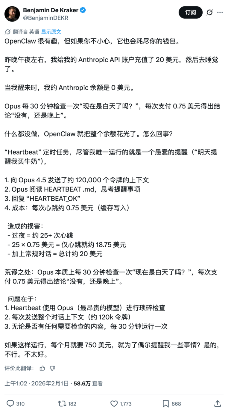 问题是,每次后台唤醒都不是一次简单的检查——系统需要向云端API发送一个完整请求,里面装着冗长的系统提示词、数十个工具的参数定义以及近期会话的全部历史记录,体积庞大。有开发者复盘后发现,系统在没有太多实际产出的状态下,仅靠心跳机制维持每天就消耗20美元,一个月白白烧掉近750美元。