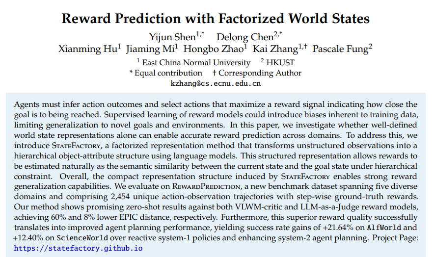 研究团队提出了一个名为StateFactory的全新方法,这个方法就像给机器安装了一副"智能眼镜",让它能够像人类一样理解环境中的各种要素,并且准确判断自己的进度。更重要的是,这种方法不需要针对每个具体任务进行专门训练,就能在不同领域之间灵活迁移,这在AI领域是一个重大突破。