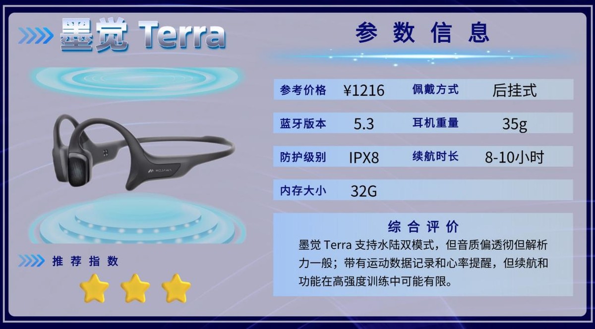 Terra更适合对训练监控有需求的用户,适合游泳、铁三、水陆交替训练或耐力跑等需要数据反馈的运动场景。佩戴存在感较强,重量偏大,不适合长时间轻便佩戴或纯通勤、休闲散步等场景;音质偏功能型,不适合对音乐细节有高要求的环境。