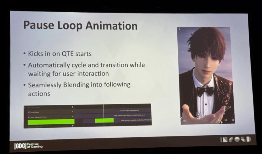 所以我们开发了一个叫做“暂停循环动画”的功能。当游戏进入QTE时,动画系统会切换到一个特殊的循环动画,同时等待玩家的输入。一旦玩家做出反应,系统就会无缝过渡到后续动作,这让表演始终保持鲜活,并保全了场景的过场沉浸感。