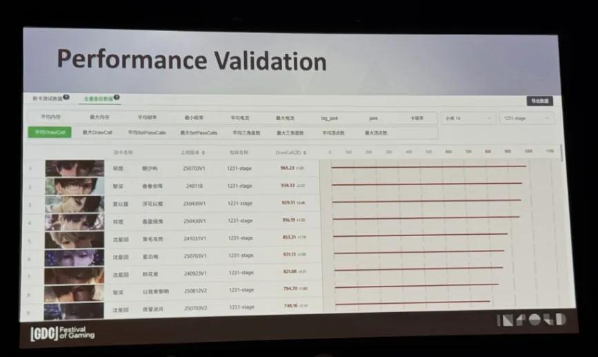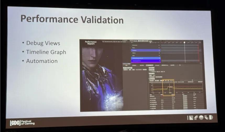 我们将性能指标和Debug视图直接整合到了编辑器里。比如,特效美术可以使用Overdraw视图来快速找出需要优化的资产。当一个过场片段完全组装好后,创作者可以直接在编辑器里播放整个序列,同时收集关键的性能指标,结果会以时间轴的形式呈现,有问题的片段会自动高亮显示。