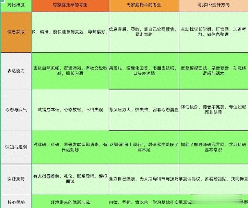 这些没有家庭托举的考研生,不是不够努力,也不是实力不足,而是在复试这场“信息战+心理战+综合素养战”中,悄悄输掉了一些“隐形筹码”。这些差距,藏在细节里,藏在认知里,更藏在成长环境赋予的底气里。