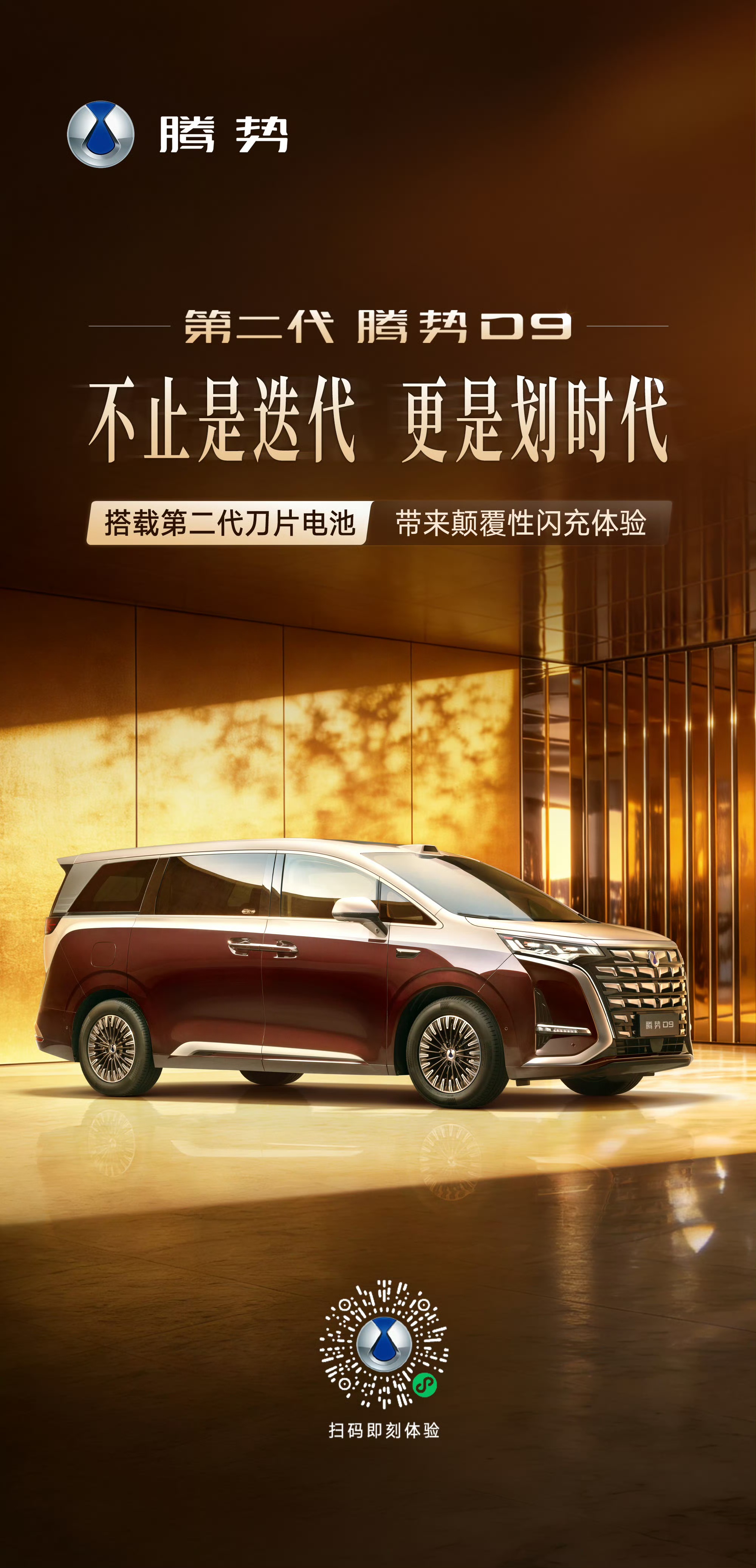 好消息…连续三年霸榜MPV销冠的腾势D9迎来重磅换代,第二代车型已完成申报,预计今年上半年上市,直接把新能源MPV带入闪充时代。