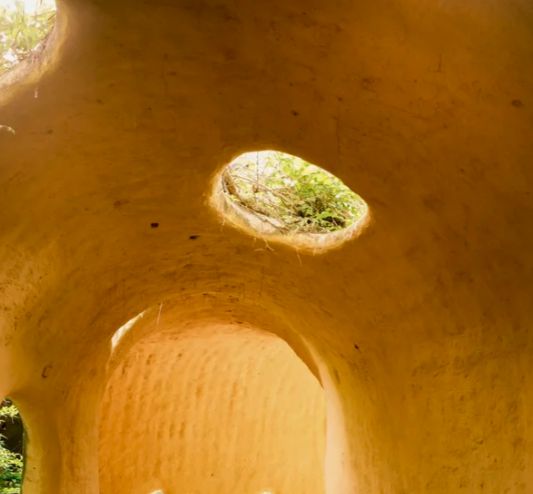 作为园区入口的标志性建筑,“蚓之丘”的设计灵感来源于蚯蚓在土壤中穿行形成的管穴结构。设计师将这一生态概念放大为具象的建筑空间,营造出大小不一、形态各异的孔洞 。当光线穿过这些洞穴投射至地面,或从孔洞中窥见天空与植被时,空间便产生了类似“虫洞”般的纵深感与未来感。