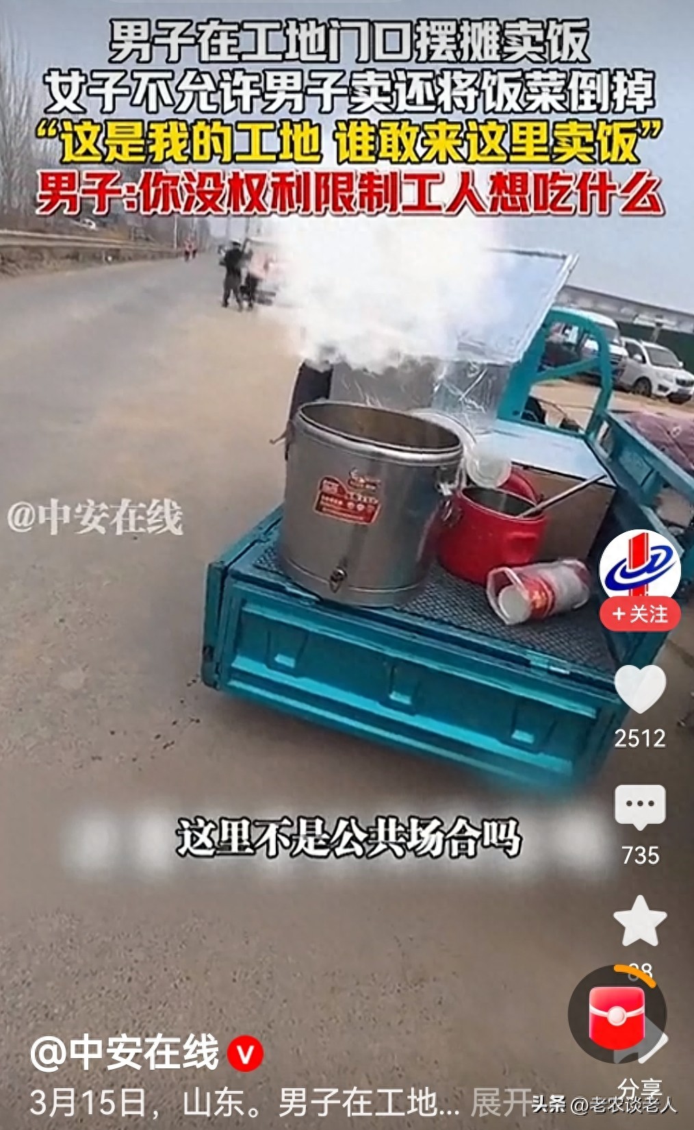 据媒体3月17日报道,一男子在工地门口摆摊卖饭,被一女子驱赶,不允许男子卖,还将饭菜倒掉,说“这是我的工地,谁敢来这里卖饭”!男子质疑问,你有什么权利限制工人想吃什么?你有什么权利限制我在这公共场合做生意?你有什么权利倒掉我的饭菜?