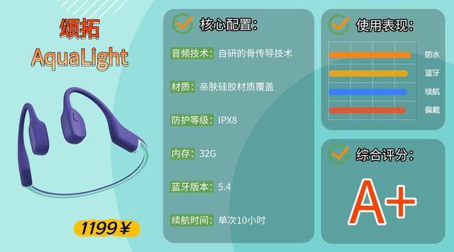 总结:颂拓AquaLight精准契合水上运动与日常训练的多元诉求,防水性能与存储配置突出,是重视水下听音体验的游泳爱好者与户外玩家的优质音频搭档。