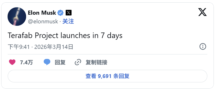 当地时间3月14日,特斯拉及SpaceX首席执行官埃隆·马斯克(Elon Musk)通过“X”平台发布推文宣布,“TeraFab计划将于7天后启动”。