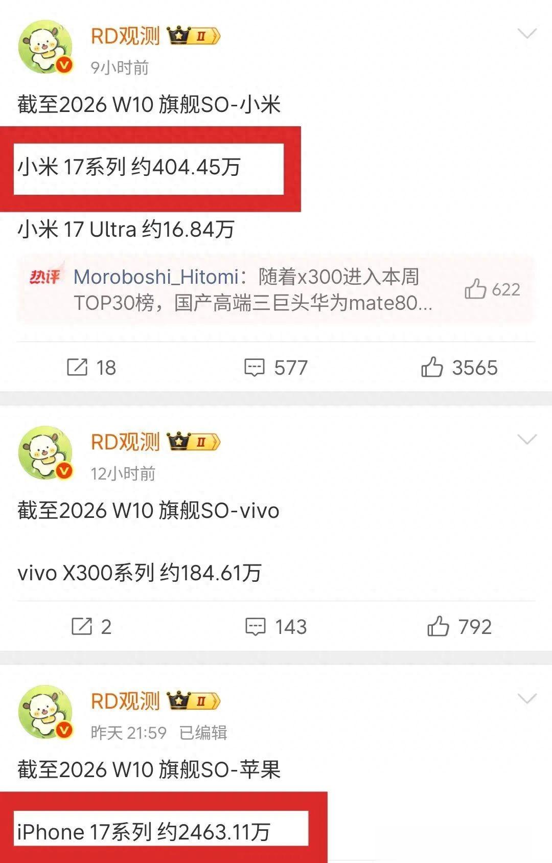 根据RD观测的数据来源,小米17系列在2026第十周的销量达到404.45万,其中小米17Ultra约16.84万。而W9的数据是391.67万,这样看来,小米17系列一周增长了12.78万,是平销期一个很正常的数字。