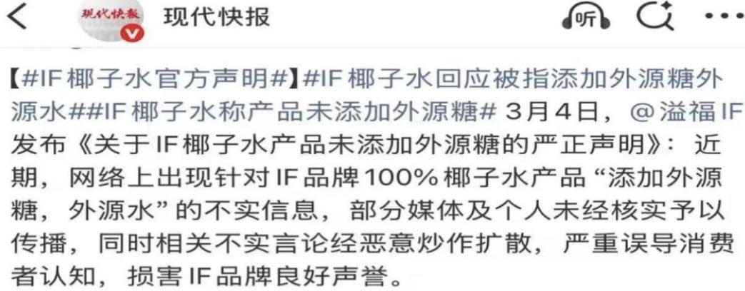 这不是什么小众品牌的翻车,而是直接牵扯到四款市面上热销的“100%椰子水”。