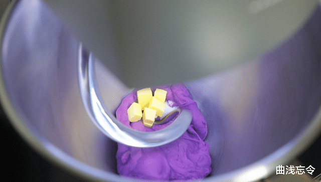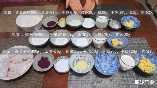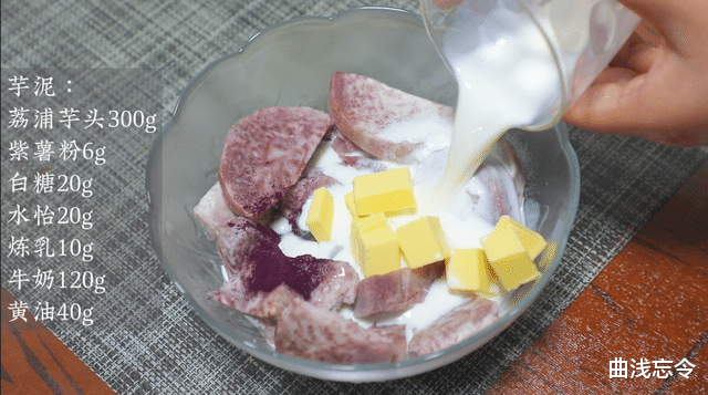 馅料:荔浦芋头300g、紫薯粉6g、白糖20g、水怡20g、炼乳10g、牛奶120g、黄油40g