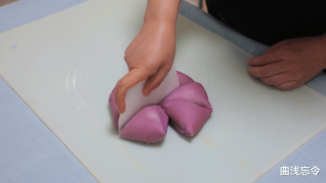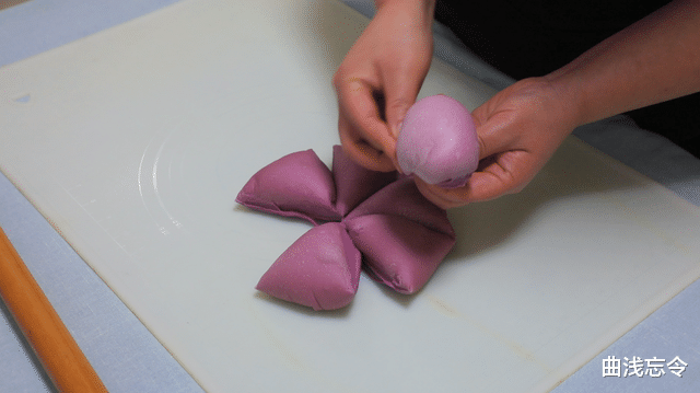 7、包馅料:将面团擀成圆片,翻过来,先放入麻薯,再放上紫薯芋泥馅用麻薯包起来,然后再用面团把它们都包起来,包成三角形,注意收口处捏紧实,三个尖角处向内捏一下收圆润。