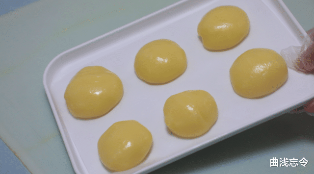 8、二次发酵:将做好的面包翻过来光滑面朝上,放置与烤盘中,再放一小碗热水保湿,发酵模式35℃发酵约1个小时左右,至明显变大。
