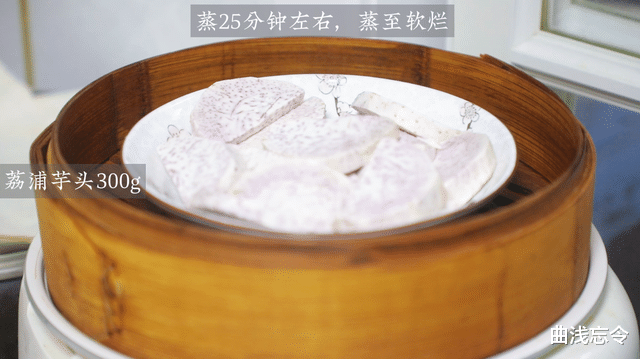 1、处理馅料:荔浦芋头去皮切块,上蒸锅蒸20分钟左右蒸熟,用筷子能戳烂的状态。