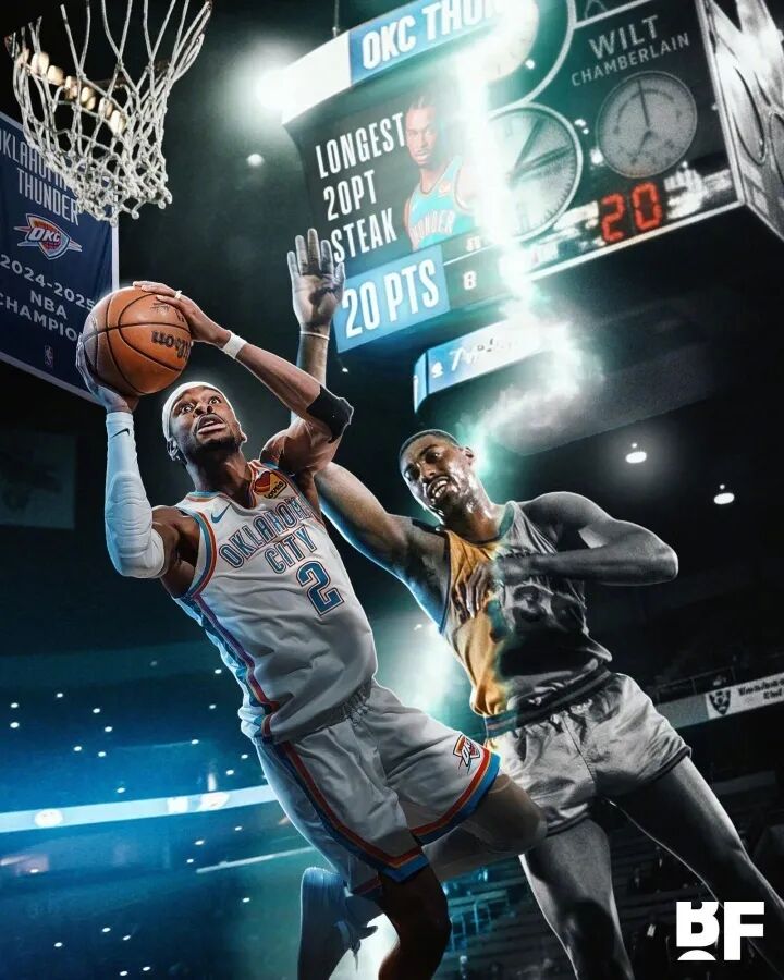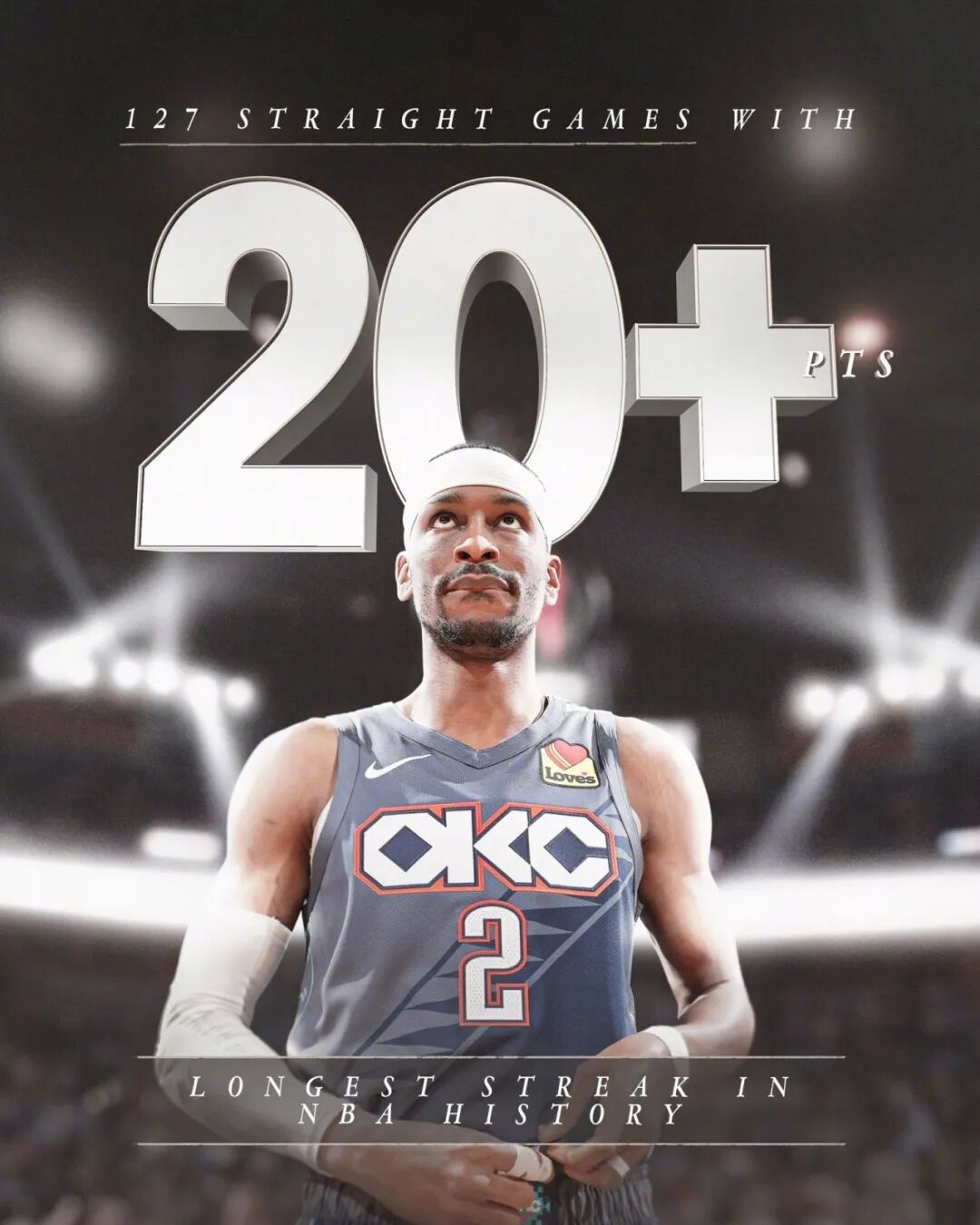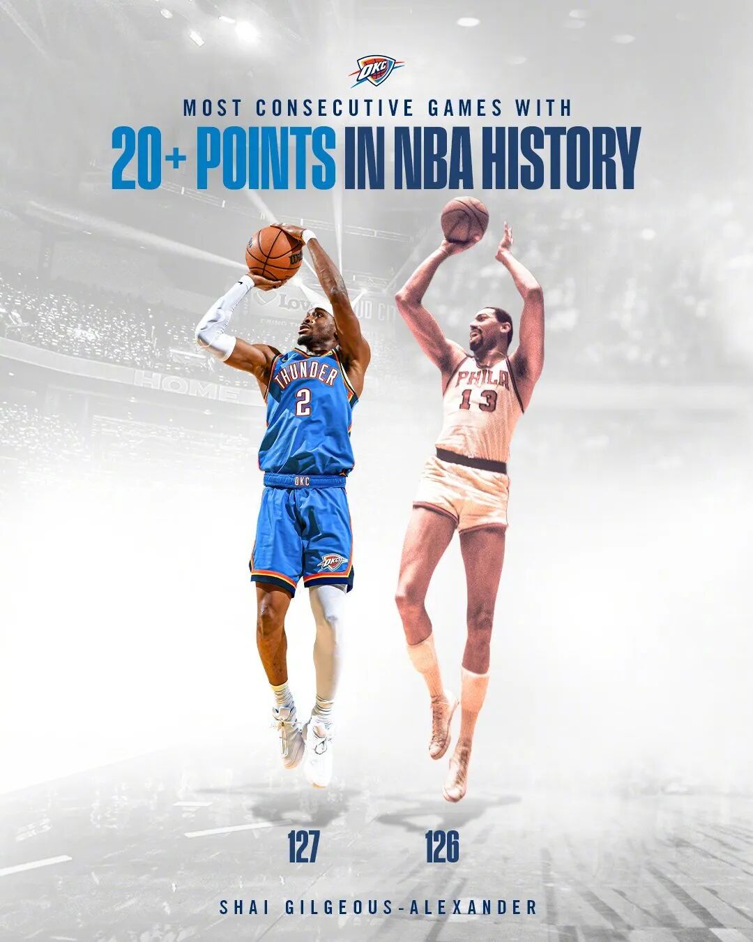 这记中投可不简单,帮助亚历山大超越张伯伦(连续126场20+),达成了连续127场20+成就,NBA官方及各大媒体也第一时间晒图庆祝。