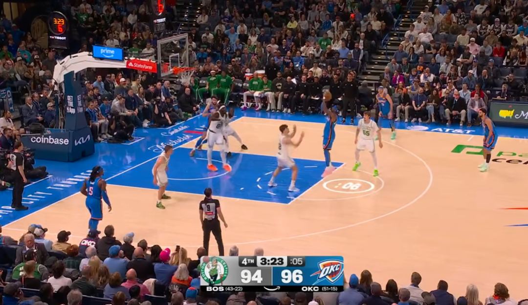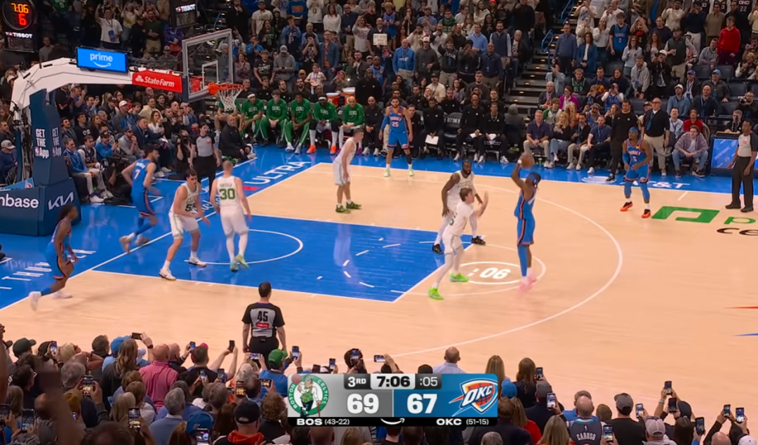 本场第三节,雷霆几乎全程落后,直至第四节剩下5分钟前,雷霆依然以93-94落后凯尔特人1分,随后亚历山大接管了比赛: