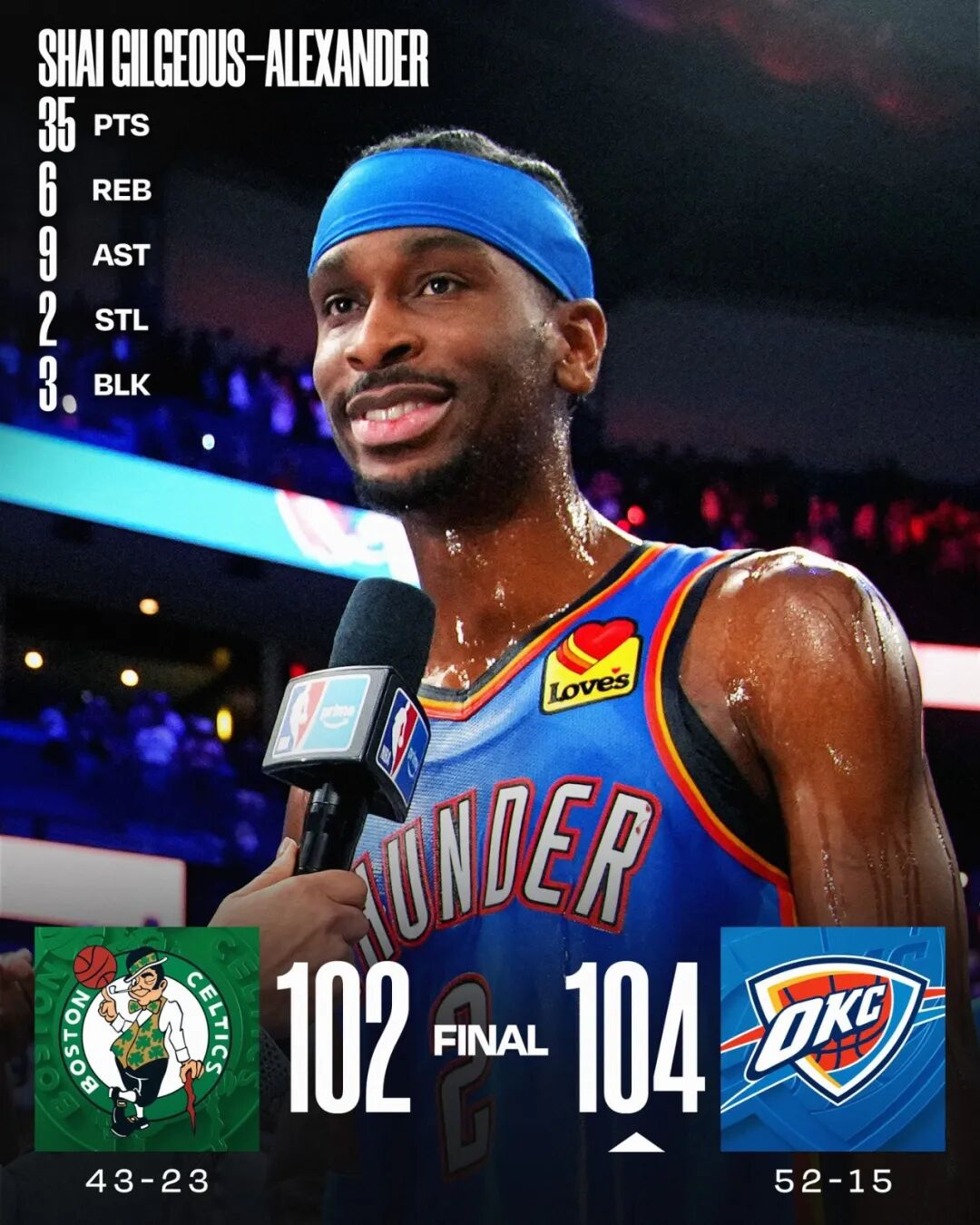 常规赛,雷霆主场104-102战胜凯尔特人。