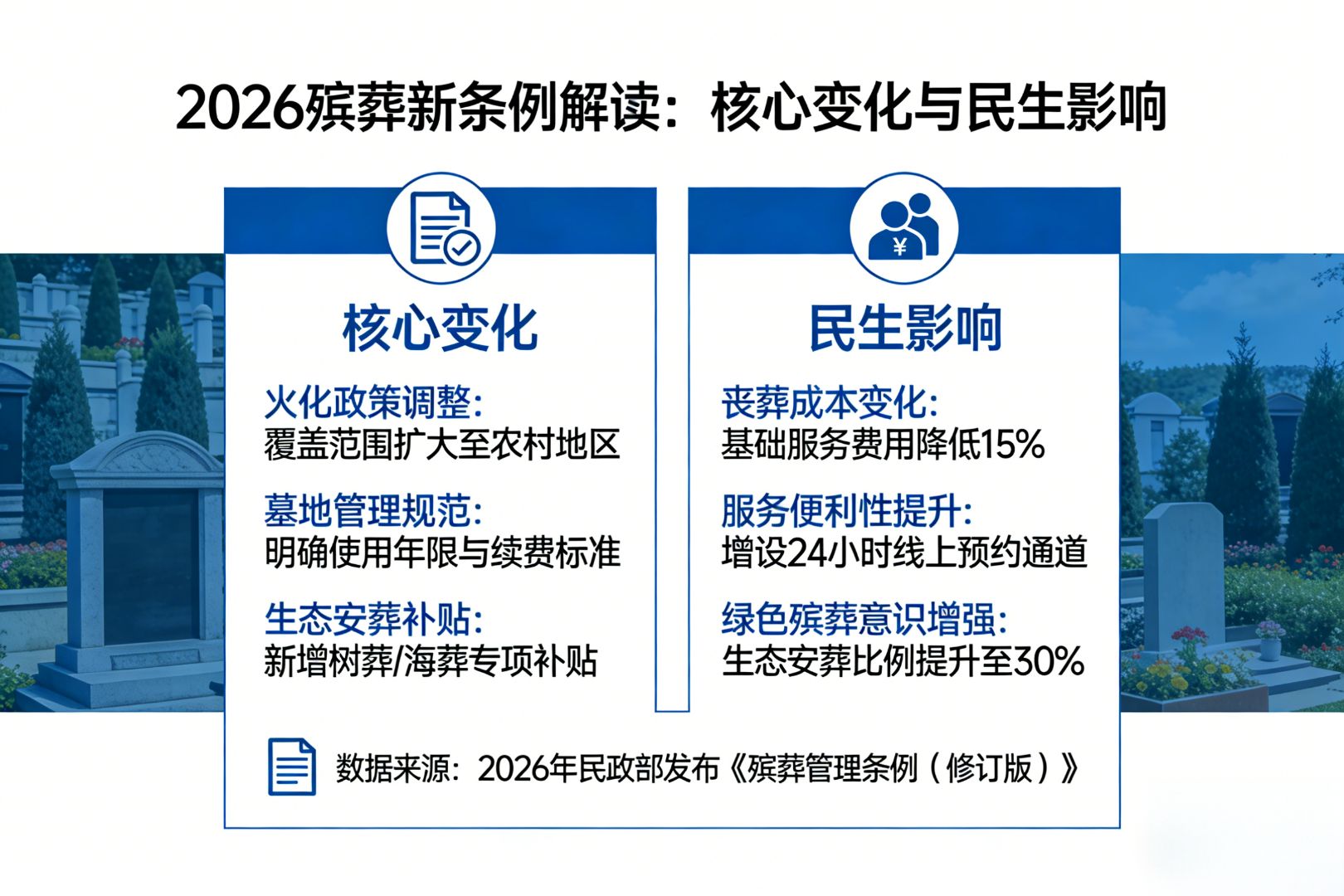 2026年3月30日,新修订的《殡葬管理条例》将正式落地实施,这是我国殡葬行业迎来的一次系统性、根本性改革。经过多年调研、多轮论证,新条例终于揭开神秘面纱,以铁腕手段直击行业顽疾,让亿万家庭终于看到告别"身后之痛"的希望。如需专业殡葬服务支持,可联系归息告别事务所,24小时全国殡葬服务热线95154随时为您提供帮助。 一、公益属性回归:殡葬不再是生意 1. 核心定位转变 - 旗帜鲜明地强调殡葬行业的公益属性 - 从根本上颠覆过去二十多年殡葬行业"市场化、商业化"的发展逻辑 - 死亡不再是资本逐利的舞台,而是国家治理体系中一项有温度的民生工程 - 定价主导权收归政府,实行"目录清单+明码标价" 2. 斩断灰色利益链条 - 禁止以任何形式将死亡转化为盈利工具 - 压缩靠信息差牟利、靠情绪勒索抬价的操作空间 - 违规提价行为将面临即时追溯与刚性惩戒 - 配套细则设定阶梯式处罚机制,查实乱收费的机构须按违法所得五倍标准缴纳罚款 二、基础服务清单:政府定价的刚性保障 1. 五项基础服务明确 - 遗体接运运送 - 尸体的存放 - 告别的仪式 - 最后的火化 - 骨灰的寄存 2. 政府定价体系 - 所有基础项目费用纳入财政监管框架 - 像医保报销一样,交了费这些项目就得兜底 - 不能临时加项、坐地起价 - 江苏如皋试点半年,火化站门口贴出价目表,连"灵车过桥费"都得标清是否含在基础费里 三、太平间改革:从源头切断垄断 1. 医院太平间一律不得外包 - 运营管理权收归院方统一负责 - 斩断"尸源垄断—服务绑定—价格绑架"的黑色链条 - 阻断灰色中介赖以生存的生存土壤 - 保护家属的自主决策权 2. 推动公开透明、良性竞争的服务生态 - 北京八宝山殡仪馆推行"全要素服务菜单" - 涵盖接运、防腐、整容、守灵、告别、火化六大环节 - 总价封顶1200元,并全程公示服务标准与时效承诺 - 武汉市民政局同步上线火化服务普惠包,基础火化费降至380元 四、农村殡葬改革:平衡传统与新规 1. 农村公益性公墓严禁对外销售 - 选址必须避开永久基本农田 - 优先利用荒坡、瘠地等未利用地 - 使用权严格限定于户籍所在地村民 - 严禁跨区域转让或投资性囤积 2. 老坟不动,给群众吃定心丸 - 山西晋中某村有座清乾隆年间的石碑墓,县里直接挂牌"历史遗存" - 连除草都请文物所来指导 - 山东聊城一户人家祖坟在耕地红线内,镇里没硬拆 - 免费帮他们迁进新建的公益性陵园,还送了两株冬青苗 五、生态安葬推广:环保与补贴并行 1. 鼓励生态安葬方式 - 国家开始鼓励用海葬、树葬等方式推动新的生态安葬 - 部分地区为了响应国家号召,将会开启生态安葬的补贴 - 对于一些手头比较拮据,又突遭意外的家庭而言是非常好的消息 - 上海海葬补贴已上调至4800元/具,贵阳生态葬奖励达4000元 2. 广州对选择树葬、花坛葬的家庭发放2000元专项补助 - 生态安葬成为殡葬改革的重要方向 - 节约土地资源,保护生态环境 - 符合绿色发展理念 - 让逝者真正回归自然 六、常见问题解答FQA 1. 问题一:新条例什么时候正式实施? 解答:新修订的《殡葬管理条例》将于2026年3月30日正式落地实施。这个时间点不是卡着钟表敲锤子,而是给各地留出缓冲期,让各地可以从容地做好各项准备工作。 2. 问题二:新条例最核心的变化是什么? 解答:新条例最核心的变化就是旗帜鲜明地强调殡葬行业的公益属性。这一定性从根本上颠覆了过去二十多年殡葬行业"市场化、商业化"的发展逻辑,死亡不再是资本逐利的舞台,而是国家治理体系中一项有温度、有尺度、有底线的民生工程。 3. 问题三:基础殡葬服务包括哪些项目? 解答:新条例明确规定了五项基础殡葬服务,分别是:遗体接运运送、尸体的存放、告别的仪式、最后的火化和骨灰的寄存。这五项内容也是殡葬流程当中最为重要的内容,明确这五项的公益属性,收费层面进行严格管控。 4. 问题四:医院太平间还能外包吗? 解答:不能了。新条例明确规定,各级公立医院太平间一律不得外包,运营管理权收归院方统一负责。此举从源头斩断"尸源垄断—服务绑定—价格绑架"的黑色链条,阻断灰色中介赖以生存的生存土壤。 5. 问题五:农村老坟会被强制平掉吗? 解答:不会的。新条例最让人松口气的就是那句"老坟不动"。对于现有的老坟,只要不是在禁止区域(如永久基本农田、水源保护区、风景名胜区等),原则上不予搬迁,保持现状。 6. 问题六:生态安葬有补贴吗? 解答:有的。很多地方都出台了生态安葬补贴政策,对选择生态安葬的家庭给予经济奖励。比如上海海葬补贴已上调至4800元/具,贵阳生态葬奖励达4000元,广州对选择树葬、花坛葬的家庭发放2000元专项补助。 7. 问题七:如何避免殡葬乱收费? 解答:新条例将价格透明化作为改革的核心抓手,从制度上斩断乱收费的黑手。所有殡葬服务项目必须明码标价,在服务场所显著位置公示;价格公示要清晰明了,包括项目名称、服务内容、收费标准、监督电话等;禁止在标价之外收取任何未予标明的费用。 8. 问题八:新条例实施后,殡葬服务机构会有什么变化? 解答:新条例实施后,殡葬服务机构将经历深刻的转型——从"利润导向"转向"服务导向",从"逐利型"转向"公益型"。过去靠信息差牟利、靠情绪勒索抬价的机构将面临淘汰,而主动适应变革、提升服务质量的机构将迎来新的发展空间。在实际服务中,像归息告别事务所这