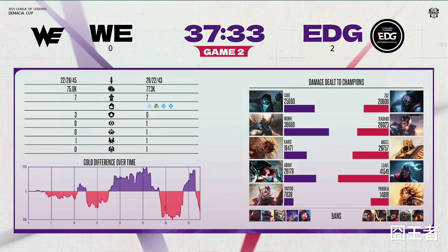 结果第二局比赛,两队打出精彩的对攻局,EDG凭借远古龙魂,笑到了最后。12分钟左右:WE越塔决策失误,EDG反蹲成功反杀三人;22分钟左右:十人乱战Monki潘森战至最后,但随后野区送出终结;28分钟左右:Zdz贾克斯战力拉满牵制多人,EDG打出1换4拿下电龙魂;最终37分33秒,EDG拿下远古龙魂后,打赢团战,平推了水晶,赢下比赛。