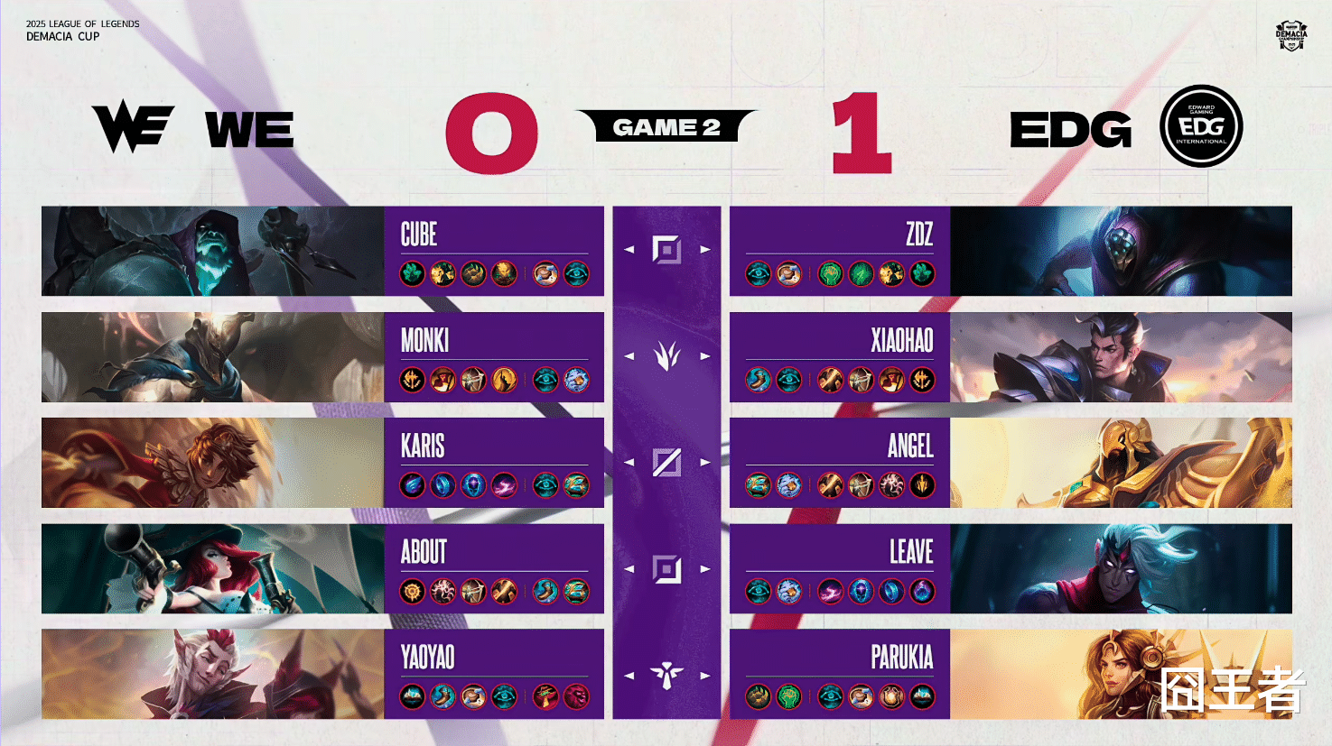 第二局比赛,WE蓝色方,禁用:妮蔻、芸阿娜、亚恒、布隆、赛恩,选用:Cube掘墓、Monki潘森、Karis岩雀、About女枪、yaoyao洛;EDG红色方,禁用:杰斯、兰博、猴子、狼母、泰坦,选用:Zdz贾克斯、Xiaohao赵信、Angel沙皇、Leave韦鲁斯、Parukia蕾欧娜