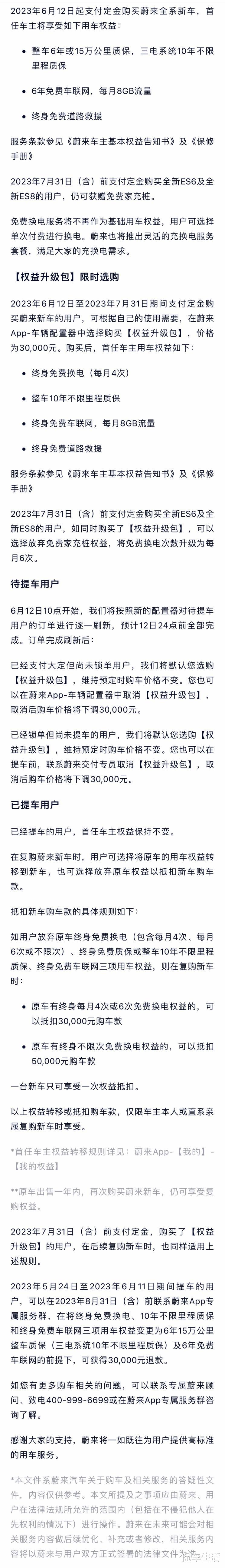 最近想入手蔚来的准车主,可不要高兴太早。此次官降的3万可是有附加条件的,众所周知蔚来相比其他品牌,有很大的一个优势就在于换电。此次官降之后,新提车的用户将不再享受老车主每月4-6次的免费换电权益。除此之外,新购车用户首任车主用车权益调整为:整车6年或15万公里质保,其中三电系统可享10年不限里程质保; 6年免费车联网;终身免费道路救援。