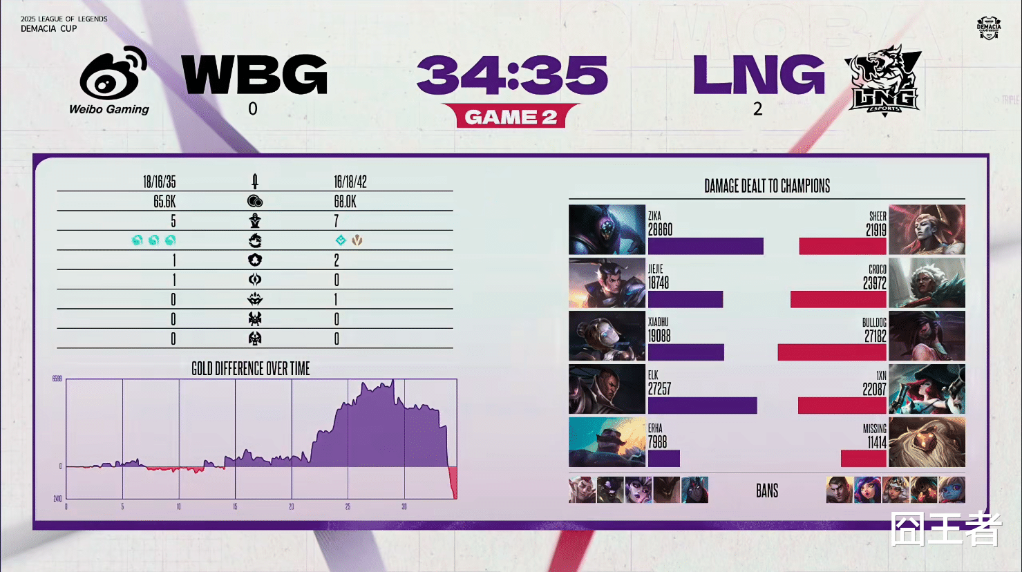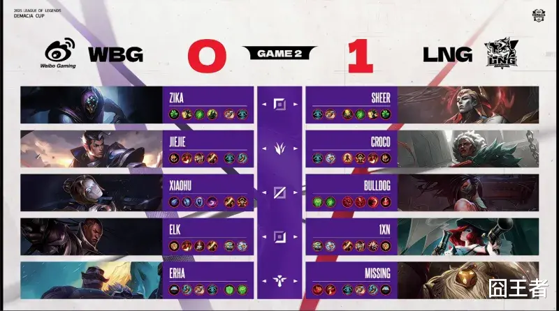 第二局比赛,WBG蓝色方,禁用:韦鲁斯;石头人;辛德拉;牛头;洛,选用:zika贾克斯;Jiejie赵信;Xiaohu发条;ELK卢锡安;Erha布隆;LNG红色方,禁用:杰斯;妮蔻;奇亚娜;泰坦;波比,选用:Sheer亚恒;Croco狼母;BuLLDoG阿卡丽;1xn女枪;MISSING巴德