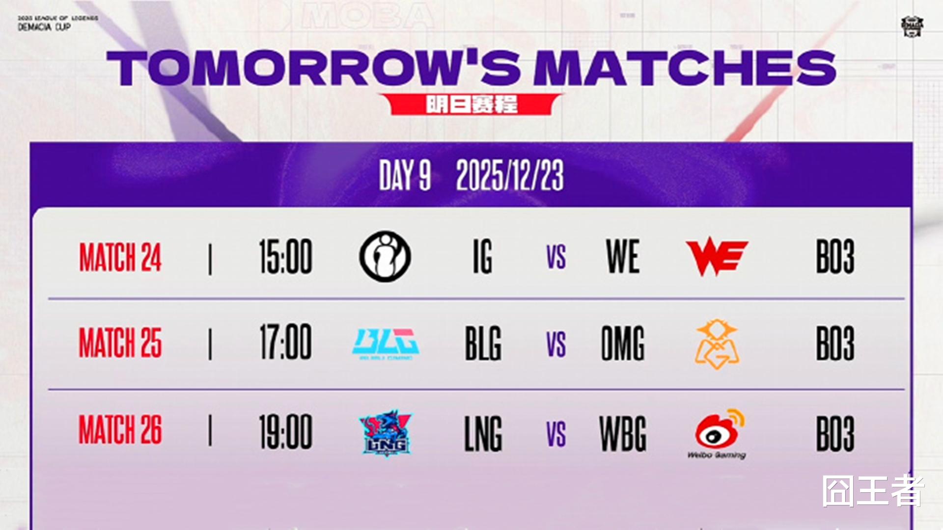 12月23日,三场比赛由IG对阵WE,BLG对阵OMG,以及LNG对阵WBG带来。在率先结束的比赛中,IG零封WE;OMG零封BLG;那么,LNG和WBG,他们谁又会笑到最后呢,让我们拭目以待。