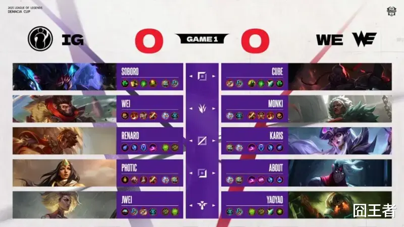 第一局比赛,IG蓝色方,禁用:沙皇、石头人、发条、牛头、潘森,选用:Soboro雷克塞;Wei猴子;Renard岩雀;Photic希维尔;Jwei芮尔;WE红色方,禁用:杰斯、妮蔻、兰博、洛、女枪,选用:Cube赛恩;Monki狼母;Karis辛德拉;About韦鲁斯;yaoyao泰坦