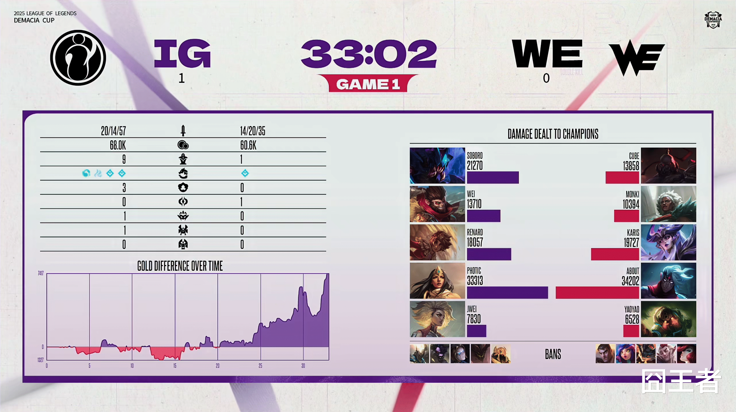 结果第一局比赛,两队在前15分钟,打得比较胶着,经济交替领先。9分钟左右:Soboro雷克塞越塔单杀About韦鲁斯,随后被WE野辅收掉人头;12分钟左右:Cube赛恩大招支援,WE打出0换3多人丝血逃生;24分钟左右:IG关键眼位抓住韦鲁斯破绽,开团击杀两人拿下厄塔汗和听牌小龙;29分钟左右:IG拿下大龙再杀两人,并成功拿下龙魂;最终33分02秒,IG团灭WE,先赢一局!