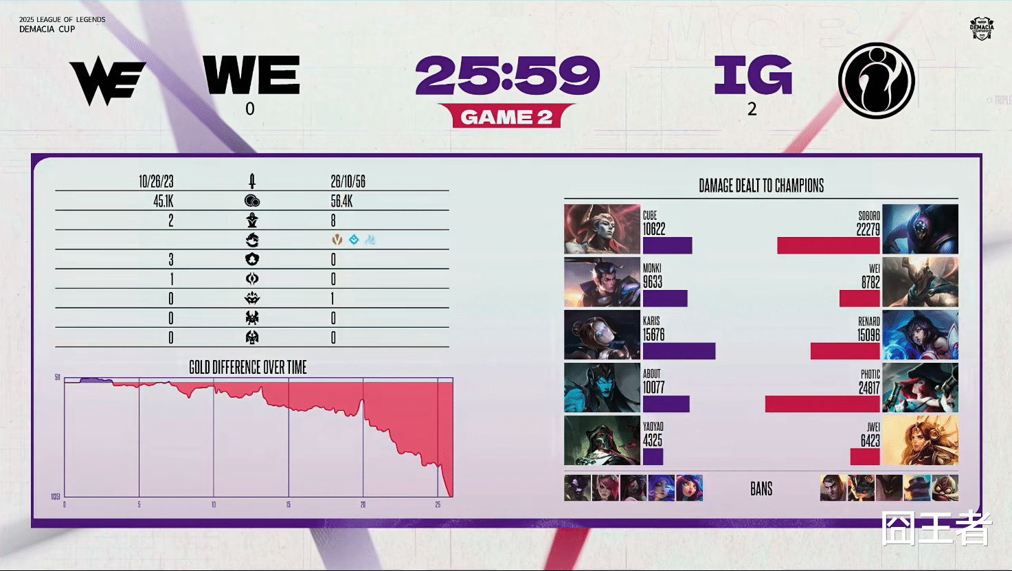 结果第二局比赛,IG依旧是呈现出碾压局,WE被打得毫无还手之力。3分钟左右:Wei潘森抓下打出双闪并成功击杀yaoyao烈娜塔;8分钟左右:Karis发条力挽狂澜,拿下三杀帮助WE止住颓势;13分钟左右:WE带线过深,IG包夹击杀四人并成功终结6-0的发条;20分钟左右:Soboro武器化身战神绕后晕三人,IG成功打出团灭;最终25分59秒,IG团灭WE,成功赢下比赛。