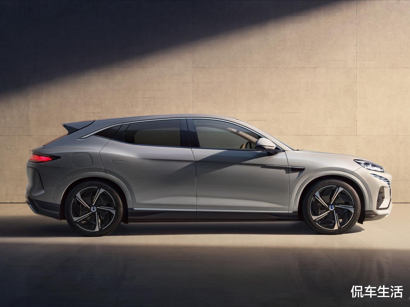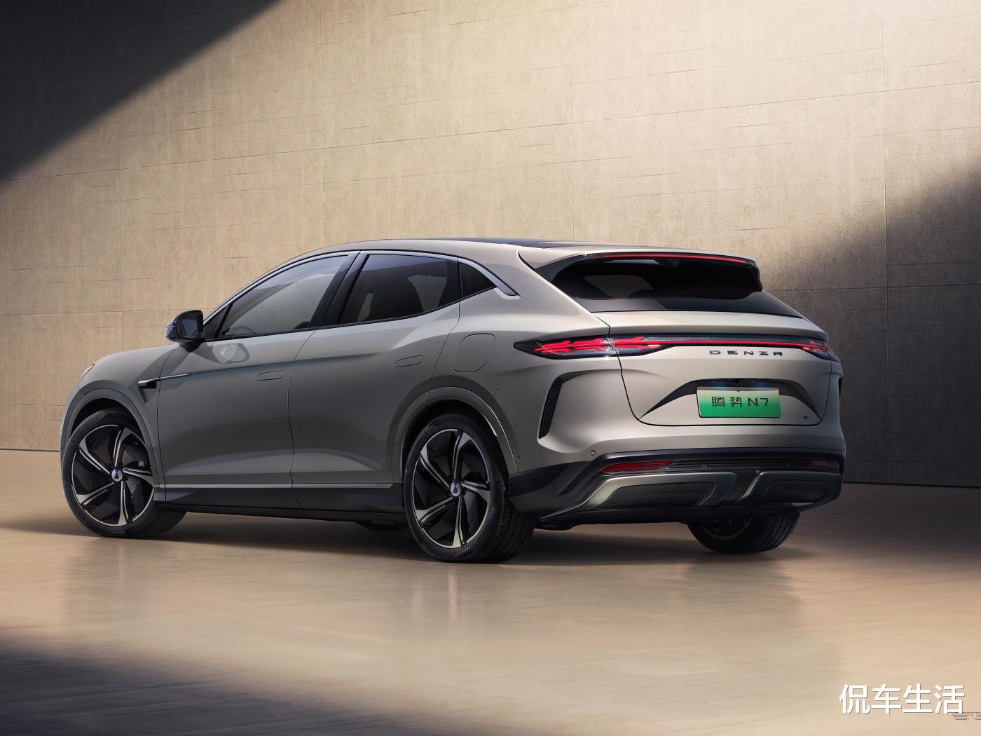 除了这个胡须以外,不得不说腾势N7的设计是非常符合我的审美的,π-Motion家族式设计理念,封闭式车头简洁大气,车身侧面采用轿跑设计,搭配有力的腰线以及隆起的后轮拱,非常动感。车尾部分整体圆润且饱满,上方有一个尺寸很大的扰流板,下方是贯穿式尾灯,两侧还有导风口,非常帅气。