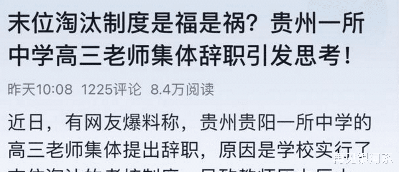 贵阳一所重点中学的初三老师集体辞职,据说这个事件的起因是学校实行了末位淘汰的考核制度,导致教师们压力加大,心理无法承受,且还有欠薪问题存在。这个消息无异于平地惊雷,自然也会引发社会各界关注和讨论。 个人觉得退出机制必须要有,该机制的目的是为了激励教师提高自身素养和业务水平,促进优胜劣汰和优化配置,本身无可厚非,制度要实行必须具有完备性和科学性,还要征求各方意见建议,且不可操之过急。所以很多人由此想否定这个退出机制纯属扯淡,一个好的制度,其实也是对真正的好老师一种肯定保护。