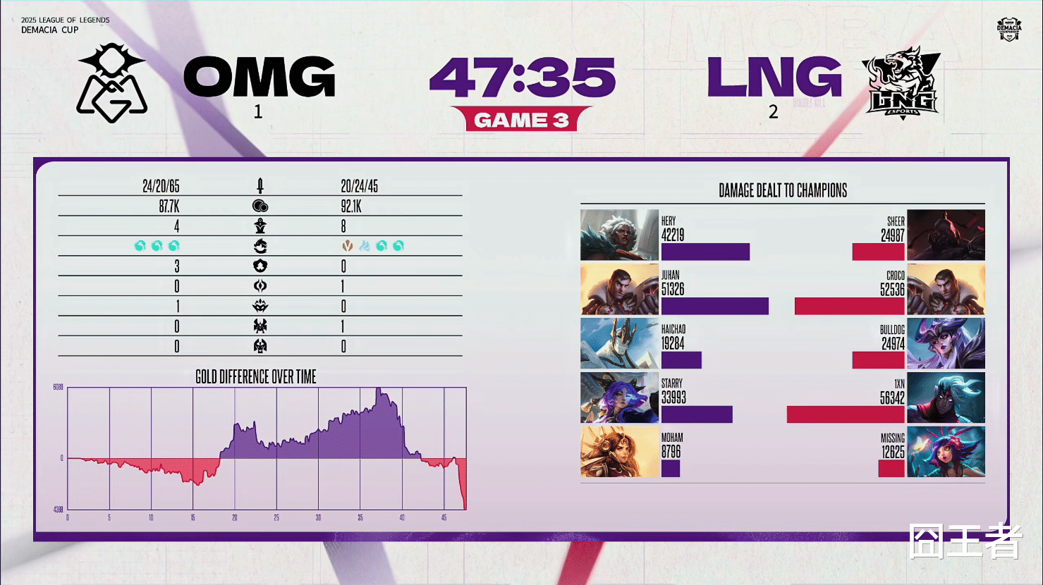 结果第三局比赛,OMG完全不想赢,他们领先接近9000,竟然被LNG绝地翻盘,我简直不知道他们怎么会输。11分钟左右:杰斯大战Croco先手占尽先机,单杀Juhan并全身而退;18分钟左右:Moham蕾欧娜大到两人,配合杰斯精准加强炮击杀三人;37分钟左右:OMG完美开团击杀三人拿下听牌龙;接下来的10分钟,就是OMG的“表演时间”,他们领先这么多,不去推塔进攻,反而是在不停的打理兵线,仿佛不担心别人反攻似的;最终47分35秒,LNG利用一连串的反攻,完成绝地反杀。