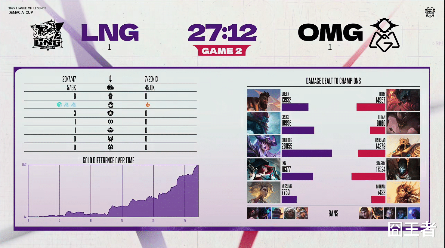 结果第一局比赛,OMG打了一把单方面的碾压局。前15分钟,OMG的比较谨慎,领先幅度不大。16分钟左右:OMG团战大获全胜击杀三人拿下先锋和小龙;23分钟左右:妮蔻闪开双C,OMG团战完美配合打出1换5拿下三龙;最终30分15秒,OMG团灭LNG,先赢一局。