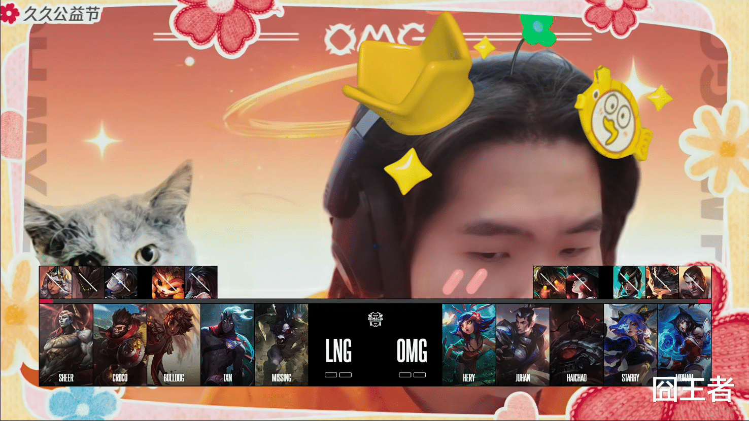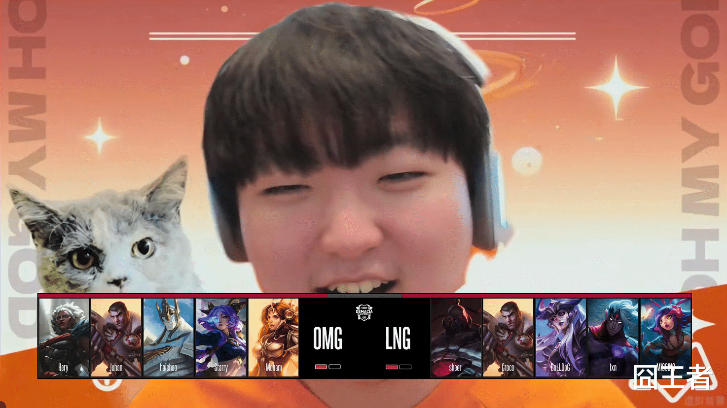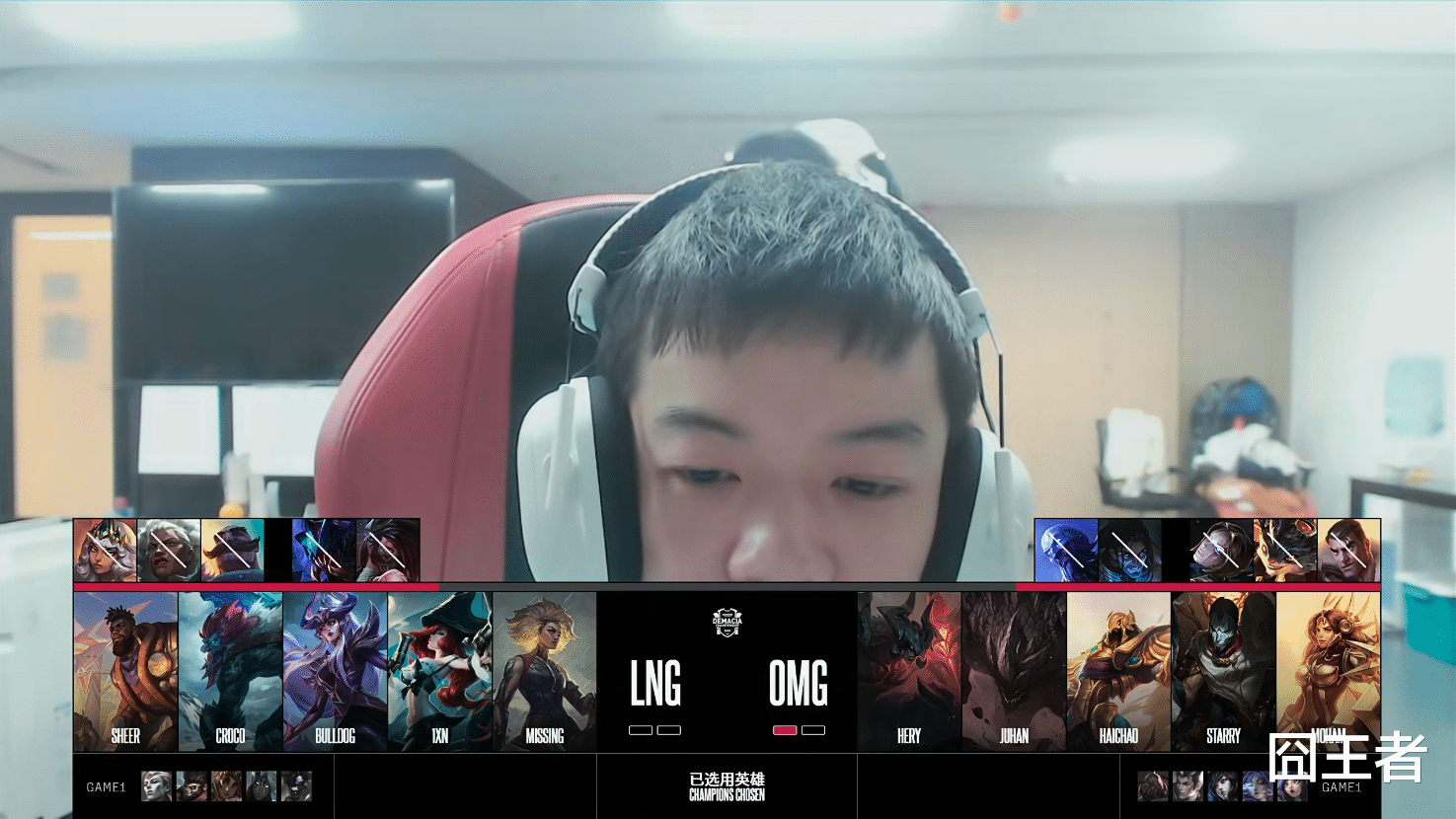 第一局比赛,LNG蓝色方,禁用:奇亚娜、石头人、发条、纳尔、阿卡丽,选用:sheer亚恒、Croco猴子、BuLLDoG岩雀、1xn韦鲁斯、MISSING牛头;OMG红色方,禁用:杰斯、兰博、卡尔玛、女枪、泰坦,选用:Hery赛恩、Juhan赵信、haichao狐狸、Starry芸阿娜、Moham妮蔻