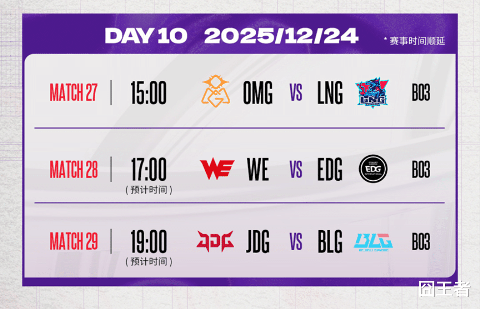 12月24日,三场比赛由OMG对阵LNG,WE对阵EDG,以及重头戏JDG对阵BLG带来。他们谁又会笑到最后呢,让我们拭目以待。
