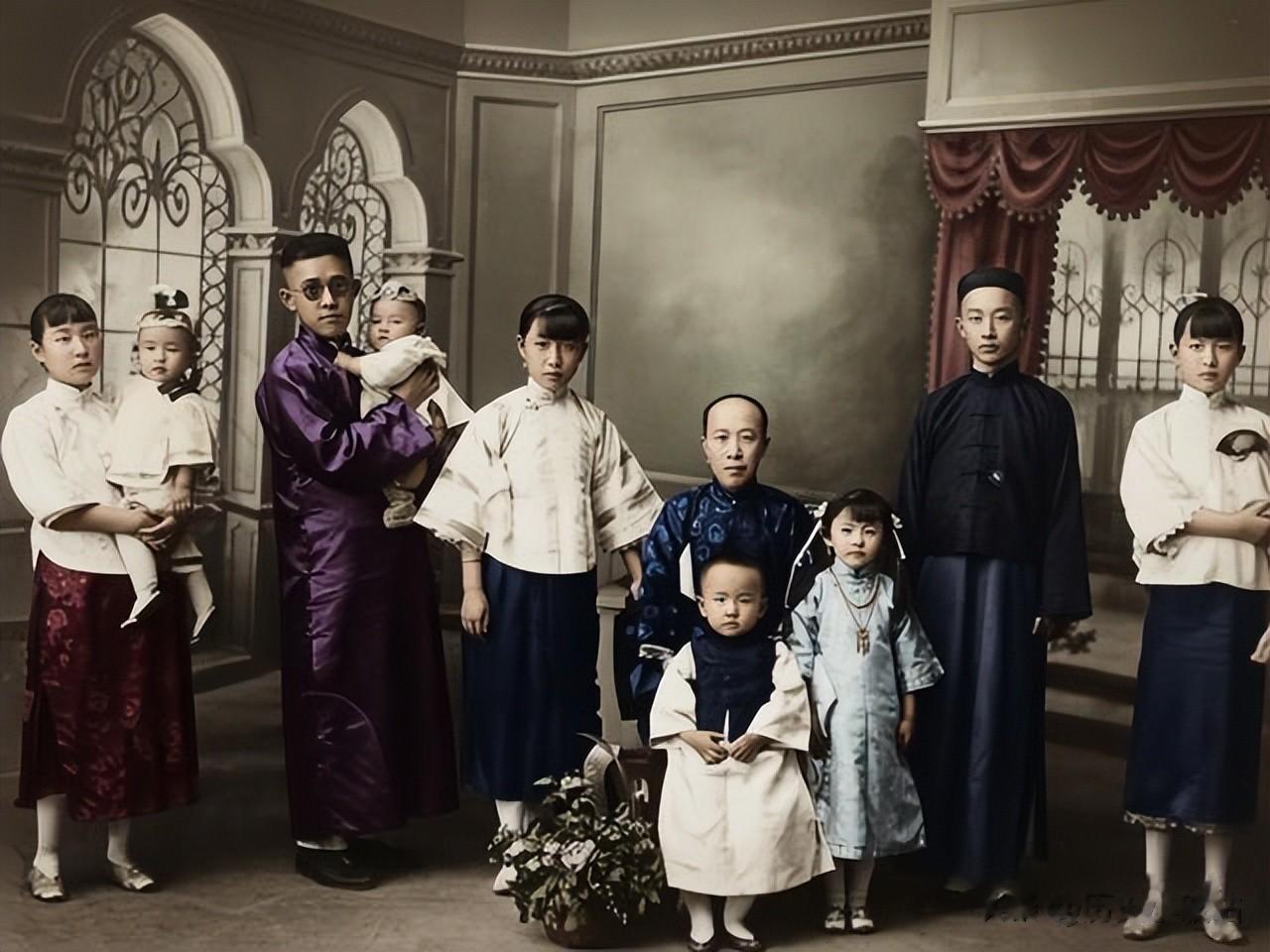 照片中央坐着的正是杨氏,是袁世凯最信任、最得宠的姨太太之一,她是天津杨柳青人,精明能干,曾掌管袁府家务,被称为“袁家王熙凤”,她身穿传统旗袍,面容端庄慈祥,目光温和却带着威严。围绕在她身边的,是杨氏所出子女及其后代,以及部分姻亲。