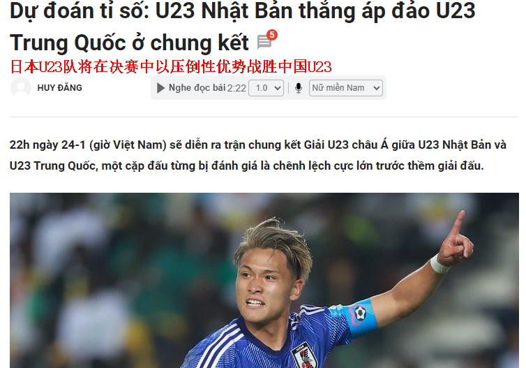 越媒Tuoitre发文(上图)预测这场决赛,认为日本队将以压倒性优势战胜中国U23。