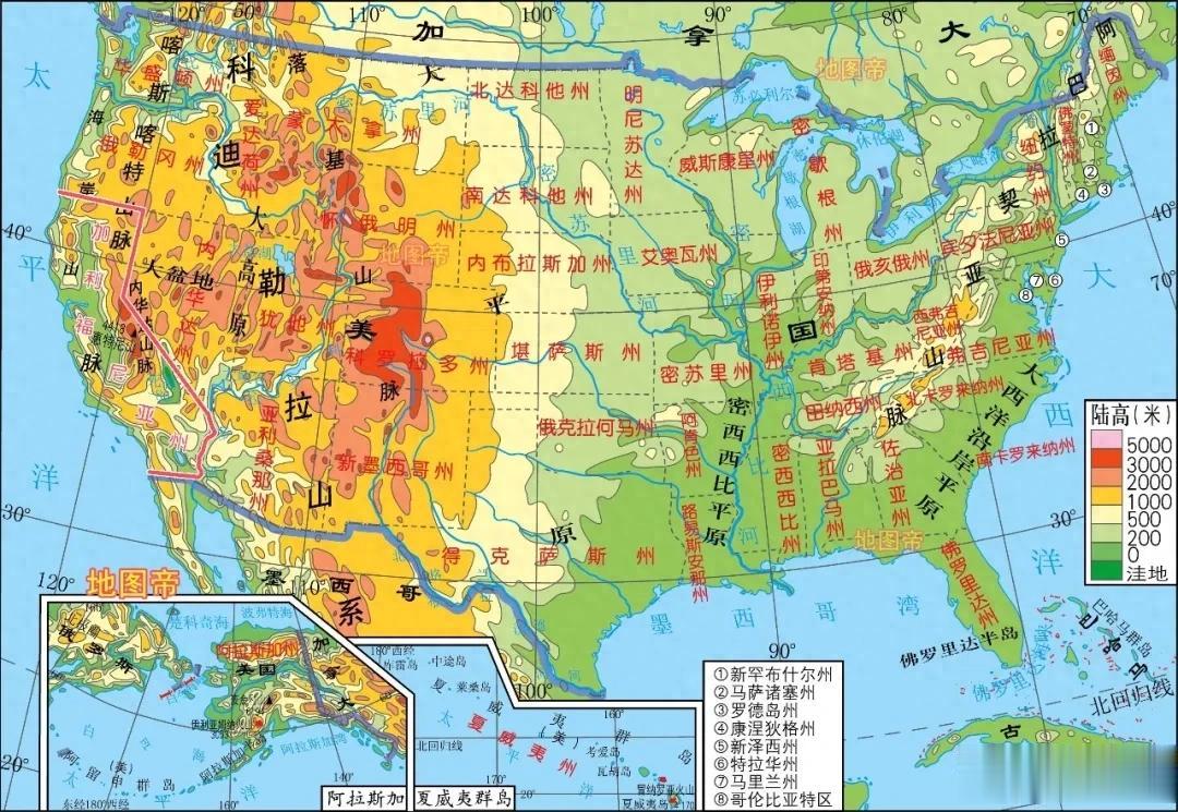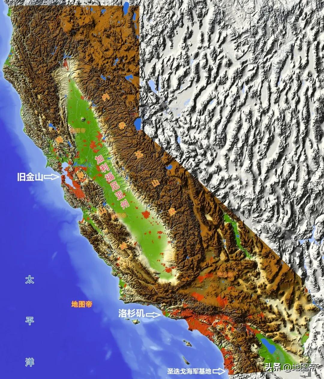 加州位于美国西部,西濒太平洋,其西部为海岸山脉,东部为内华达山脉,中间是加州盆地,最高峰为内华达山的惠特尼峰,海拔4418米,是美国本土最高点。