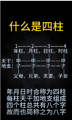 四柱八字,即生辰八字,亦称“子平术”,主要概念是命(或称命局),是应用来推测人命运休咎之法。从历法查出的天干地支八个字,
