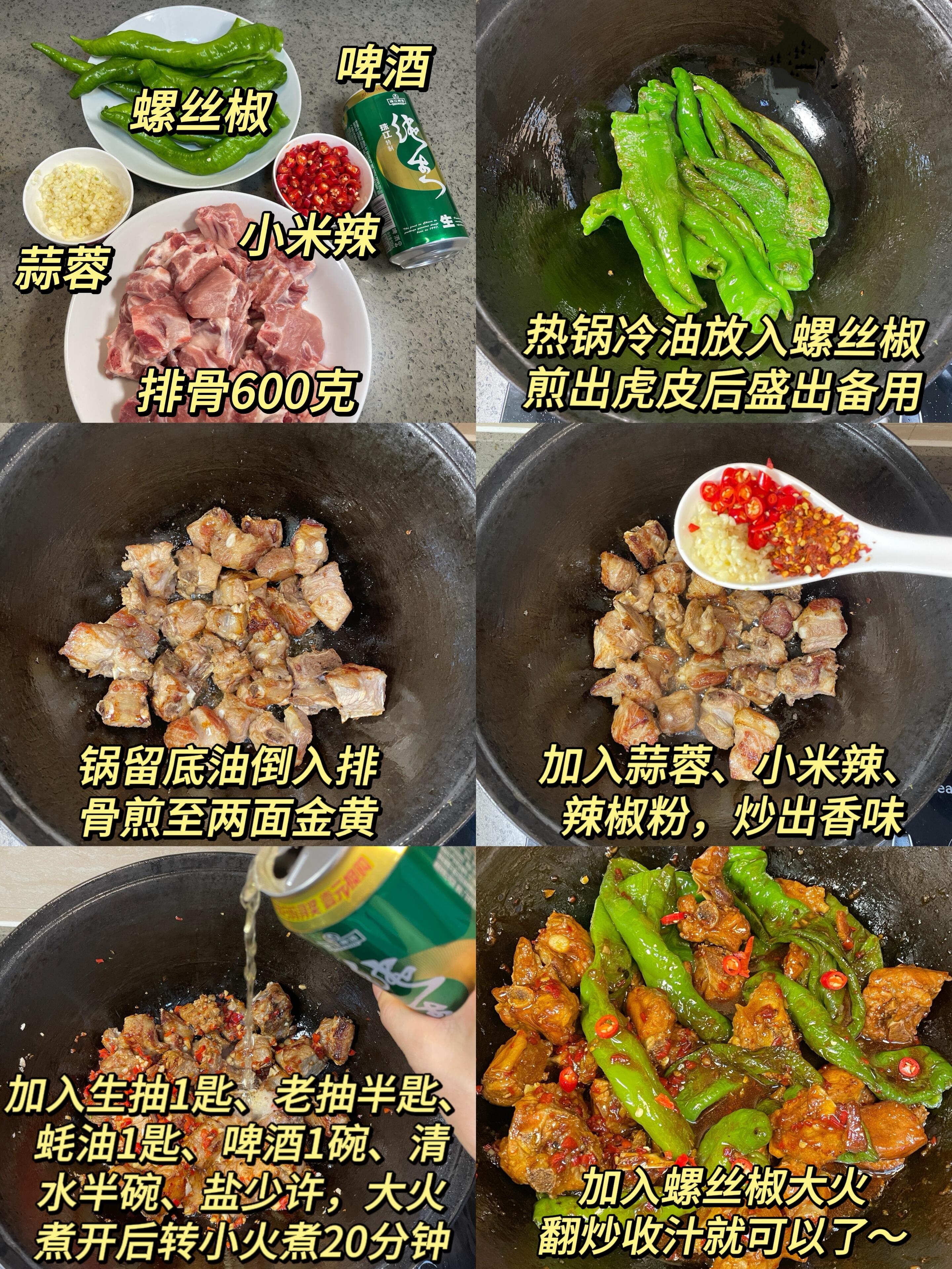 加入生抽一匙、老抽半匙、蚝油一匙,再倒入一碗啤酒和半碗清水,少许盐调味。大火煮开后转小火,慢慢炖煮20分钟,让排骨充分吸收汤汁的味道,变得软烂入味。最后,将之前煎好的螺丝椒倒入锅中,大火快速翻炒,收汁至汤汁浓稠,即可出锅。这道菜色泽红亮,排骨鲜嫩多汁,辣椒香辣可口,每一口都是满满的幸福感。