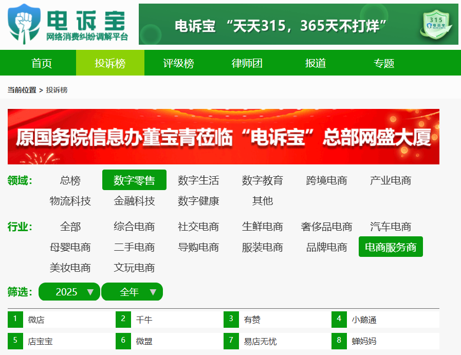 2025年全年,“电诉宝”受理投诉中涉及的数字零售中电商服务商领域用户有效投诉显示(依据投诉量排行),“小鹅通”排名第4位。最新评级为“不予评级”。除此之外,其他被投诉的类似服务商还有:微店、千牛、有赞、店宝宝、微盟、易店无忧、蝉妈妈。