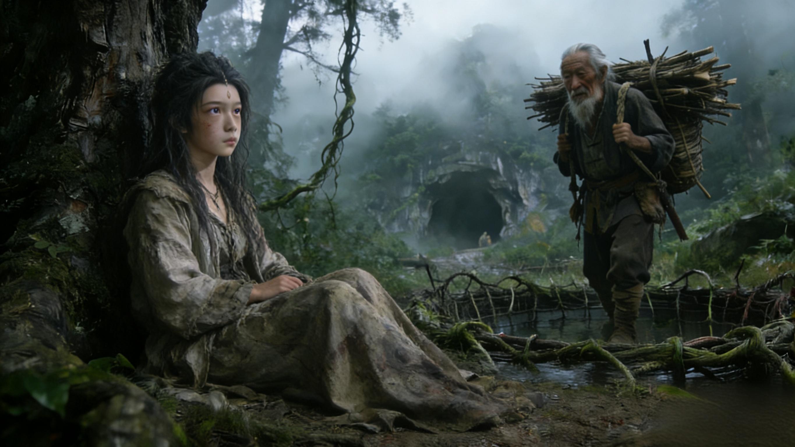 七天后,阿蛮被一位路过的老樵夫发现。老樵夫年近六十,无儿无女,靠着砍柴卖柴为生,日子过得十分清苦。他见阿蛮可怜,又想着自己年纪大了,正需要个丫头伺候,将来还能给她找户人家,换些彩礼养老,便将她带回了家。