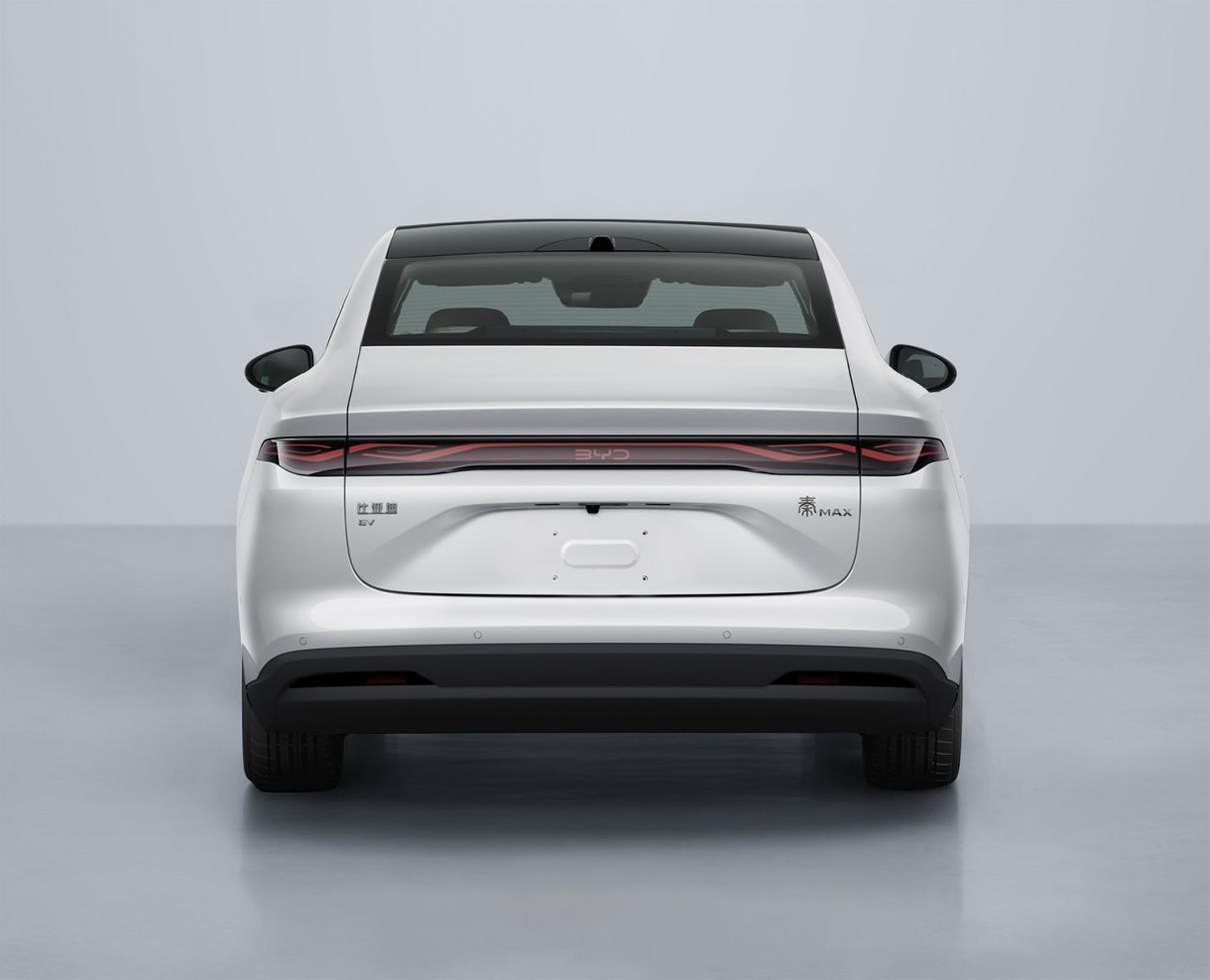 在车尾部分,应该说无论是后风挡、尾门,还是后保险杠设计,秦MAX相对来说是比较干练的,这里并没有车头看上去那么个性。不过,它的贯穿光带确实也有了一些汉家族的效果,内部的交错光带看上去更高级,而两侧带有的切角样式,则能让秦MAX降低一些年龄感。另外,车辆还除了提供诸多感知硬件选项外,比亚迪还提供了“大秦”、“秦Ultra”尾标,不知道会不会有对应的特殊配置。