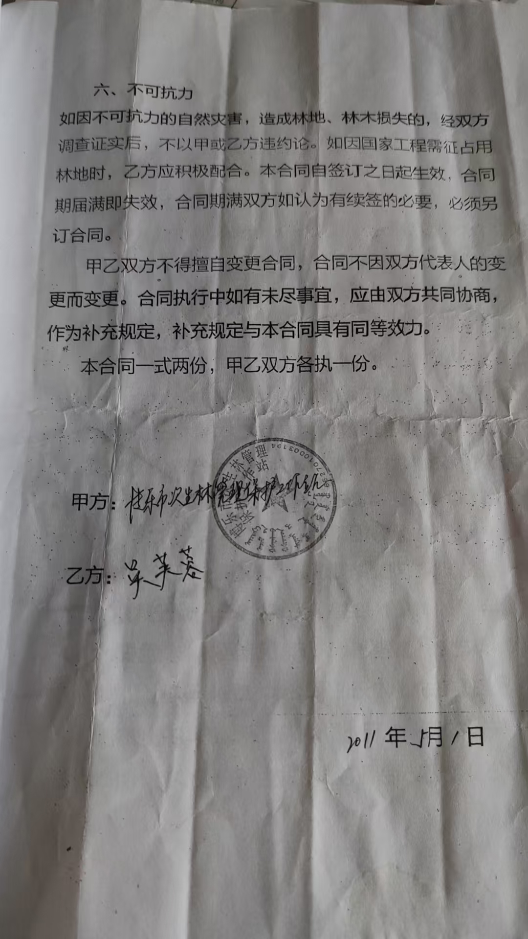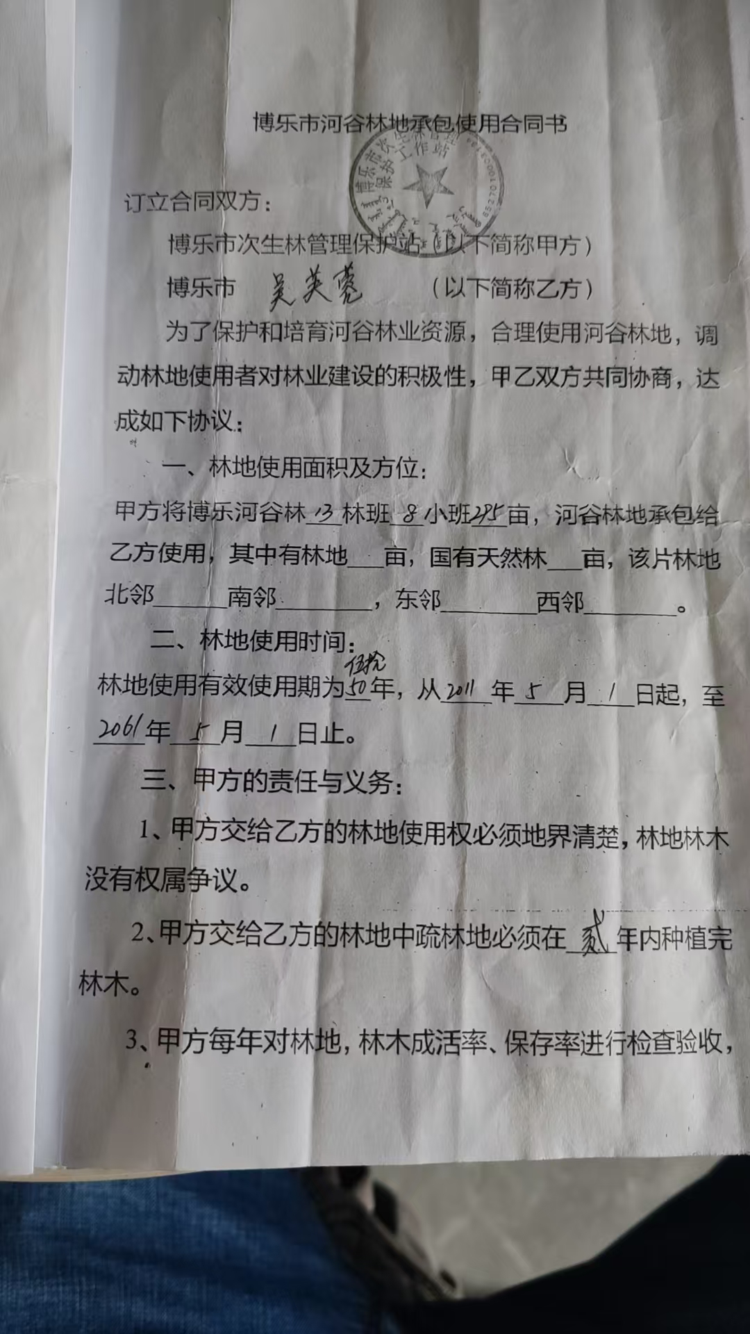 从林地冲毁到复议风波(一)林地覆灭:防洪坝改道冲毁50年承包林2011年5月1日,吴芙蓉与博乐市次生林管理保护站签订合同,合法承包博乐河谷林13林班8小班295亩林地,承包期50年。然而,2024年3月,博乐市水利局以“防洪工程”为由,在未征得同意、未签订补偿协议的情况下,强行施工改道河水,导致吴家玉承包的林地两次被冲毁,近20亩土地深陷1米多深的积水区,1500余棵树木损毁殆尽。