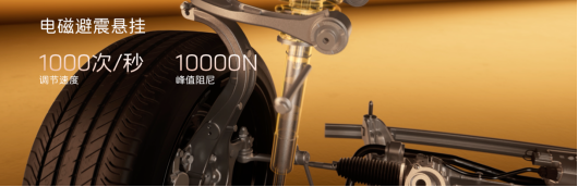 电磁避震技术,则在低摩擦力电磁液配方+系统算法优化双重加持下,支持全段阻尼无级调整,是行业响应最快、阻尼带宽最大的避震系统。在连续减速带、碎石路等路况下,系统以每秒1000次的频率进行阻尼无级调节,连续过滤颠簸,提升驾乘舒适性。在紧急避让、高速过弯等瞬态大阻尼场景中,可瞬间建立超过3500N阻尼力,抑制车身侧倾与俯仰;在高速飞坡、起伏路等大行程场景中,峰值阻尼力可超10000N,避免悬挂触底。