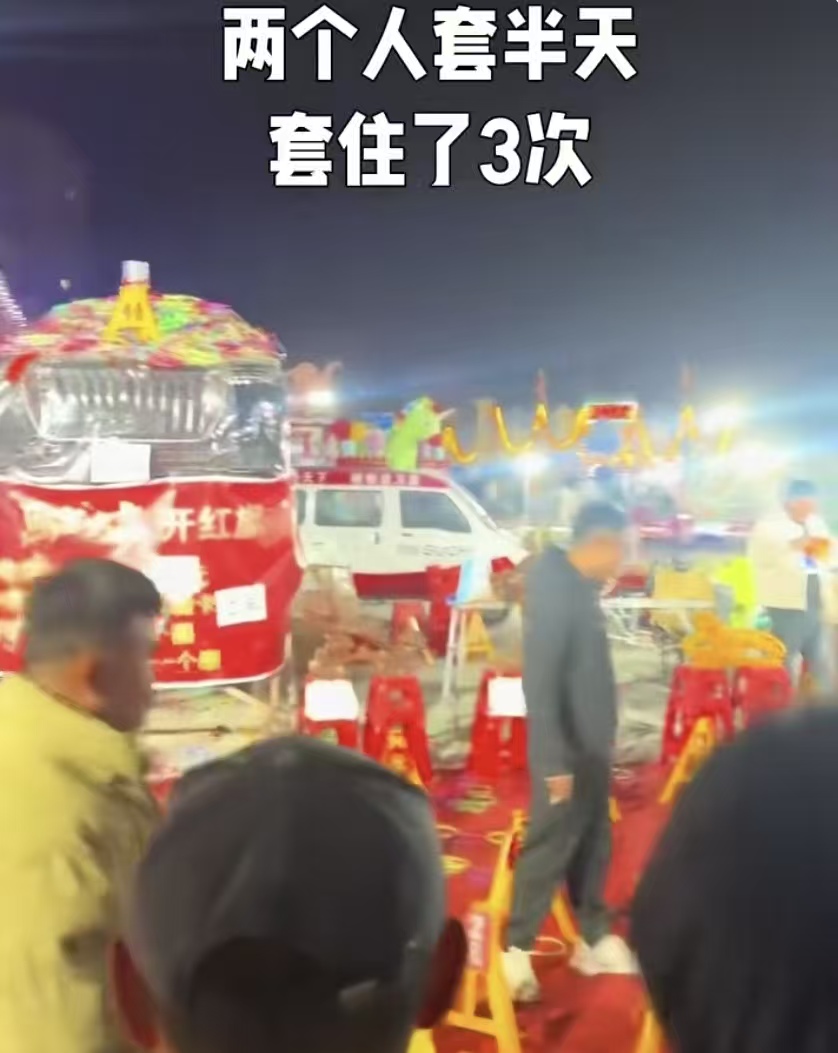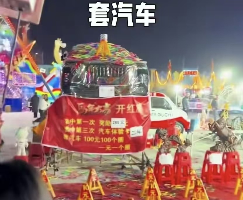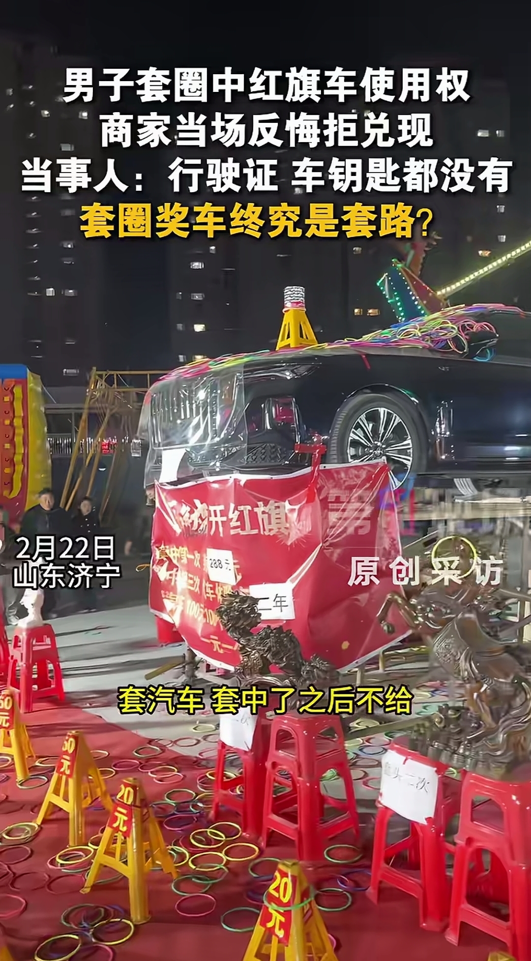 2月22日,山东济宁的一个夜市上,一家套圈摊主拿着大喇叭反复宣传:"套中三次,红旗车两年使用权直接送!说到做到,不玩虚的!"