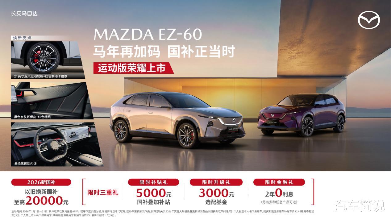 长安马自达在新春将至之际,为广大消费者带来了令人振奋的消息,旗下MAZDA EZ-60运动版焕新上市,CX-50全系也同步推出限时钜惠活动。此次活动不仅展示了长安马自达对市场敏锐的洞察力,更彰显了品牌对消费者的深刻关怀。