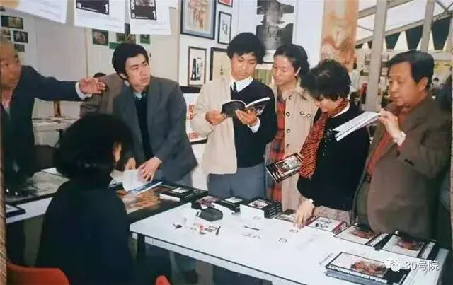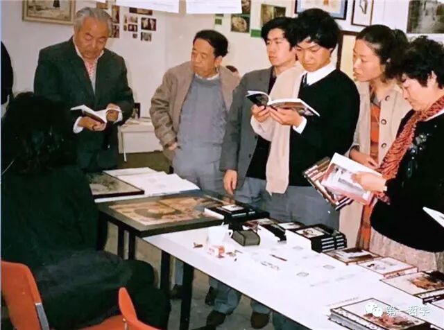 (左起:玛拉沁夫、高晓声(恰好转身)、张炜、金弢、王安忆、叶文玲、从维熙,作家团在书展上。)