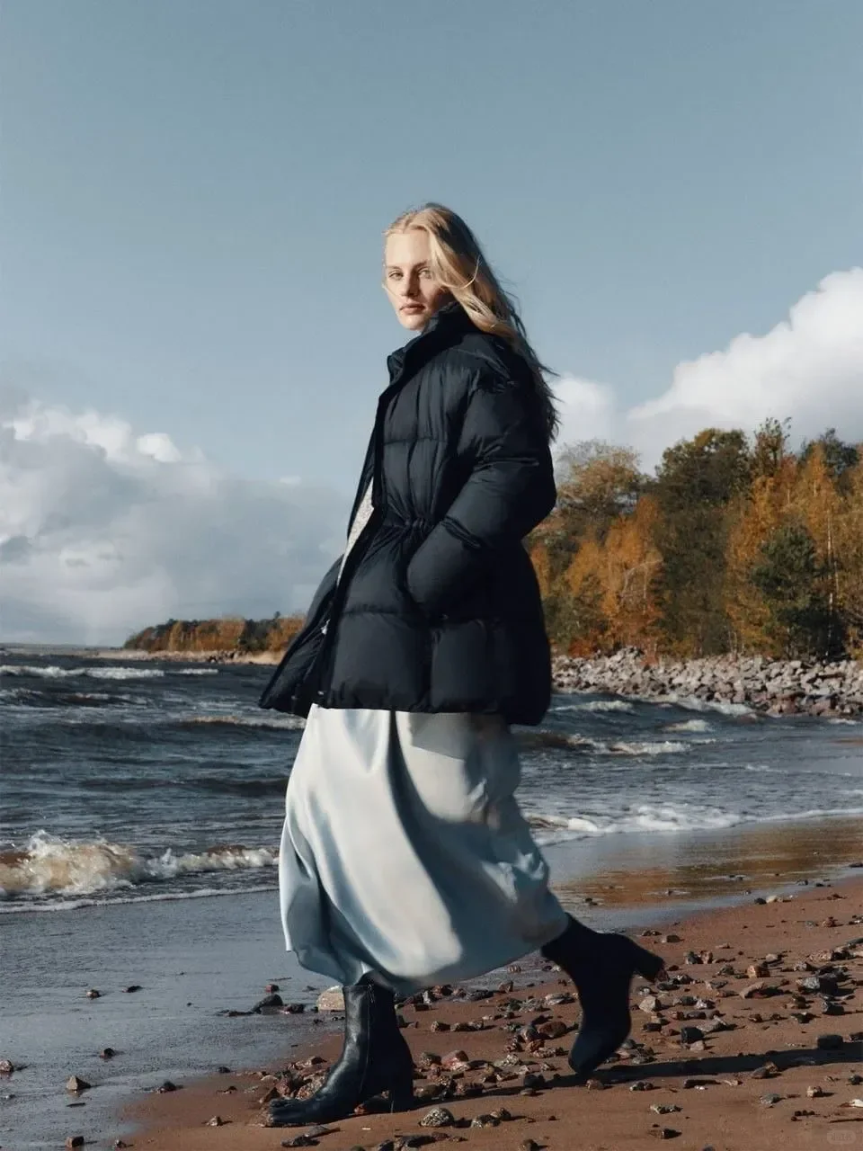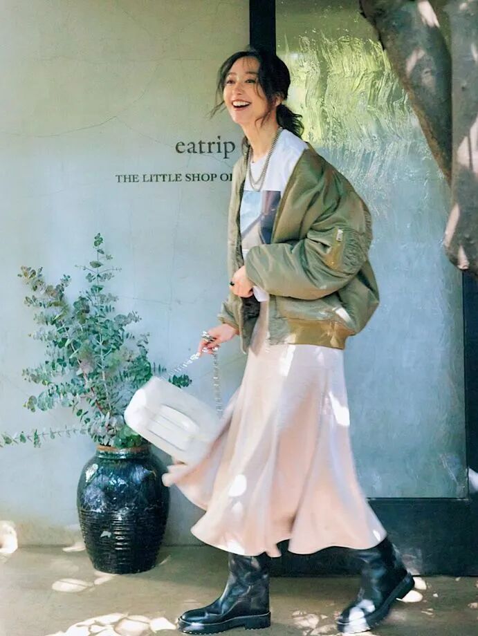 尤其当裙身的涟漪褶皱随光线流动,丝滑光泽与羽绒服的蓬松暖意碰撞,不仅中和了冬日穿搭的厚重感,更让平平无奇的羽绒服瞬间显贵。